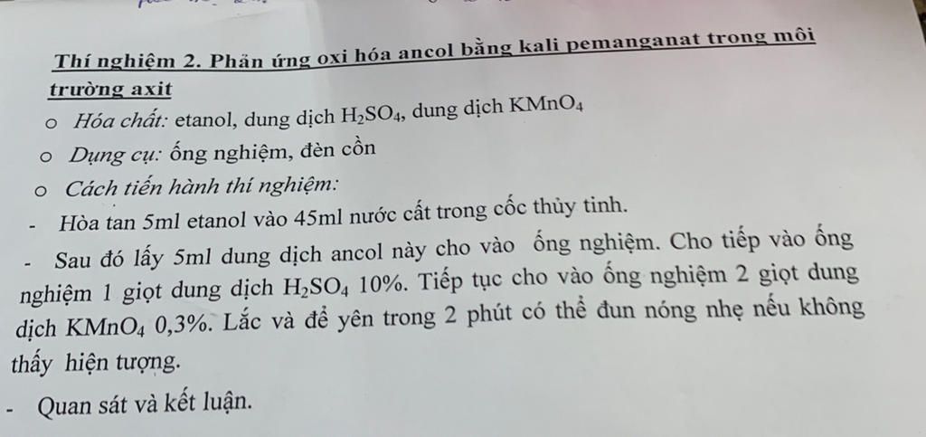 o Hóa chất: etanol, dung dịch H,SO4, dung dịch KMnO4