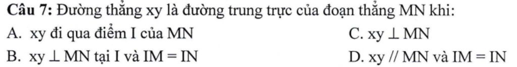 Câu 7: Đường thẳng xy là đường trung trực của đoạn thẳng MN khi: