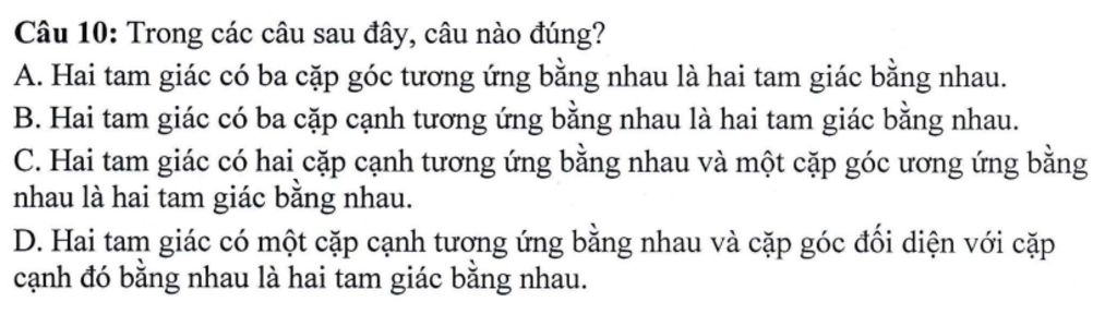 `-`Hai tam giác có một cạnh tương ứng bằng nhau và hai góc kề với cặp cạnh đó bằng nhau là hai tam giác bằng nhau