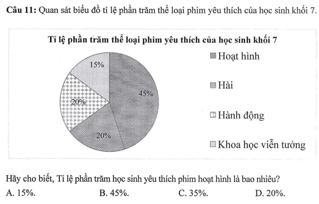 `->` Tỉ lệ phần trăm học sinh yêu thích phim hoạt hình là `45%`