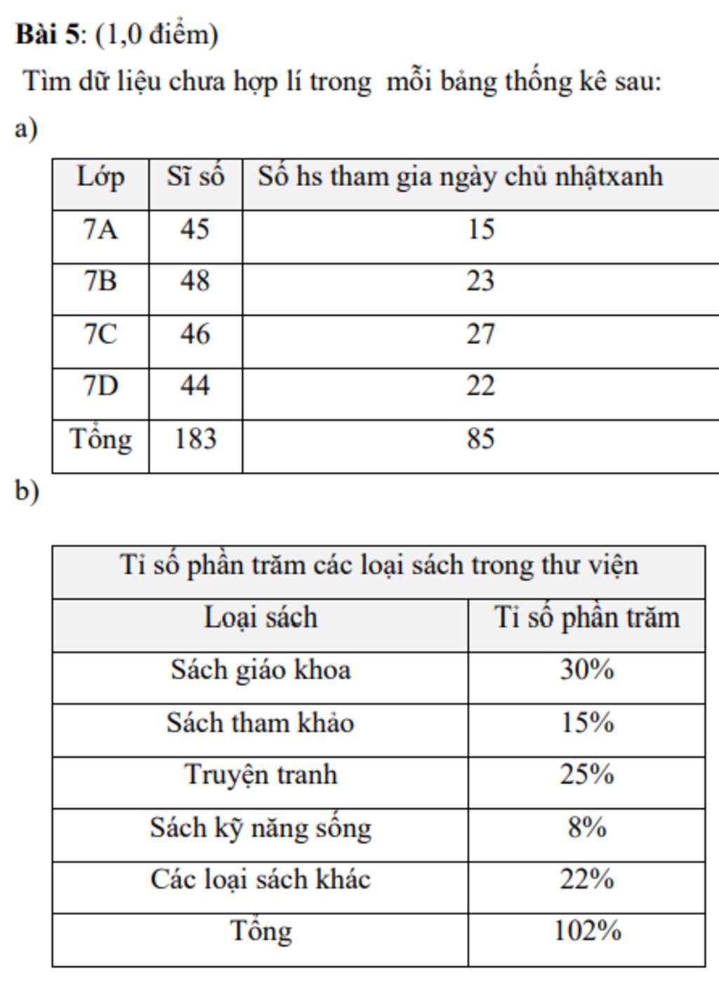 `b)` Dữ liệu chưa hợp lí là chỗ tổng ở cột "Tỉ lệ phần trăm", ra `102%` là sai phải là:
