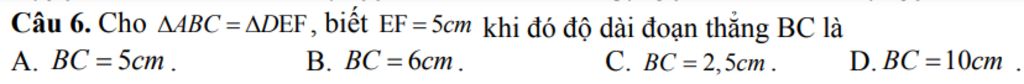 Câu 6. Cho A4BC =ADEF, biết EF=5cm khi đó độ dài đoạn thẳng BC là