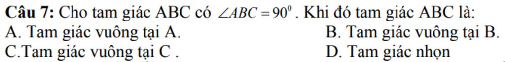 `@` `1` góc có `90^o` mà `90^o` là `1` góc vuông nên $\widehat{ABC}$ `= 90^o`