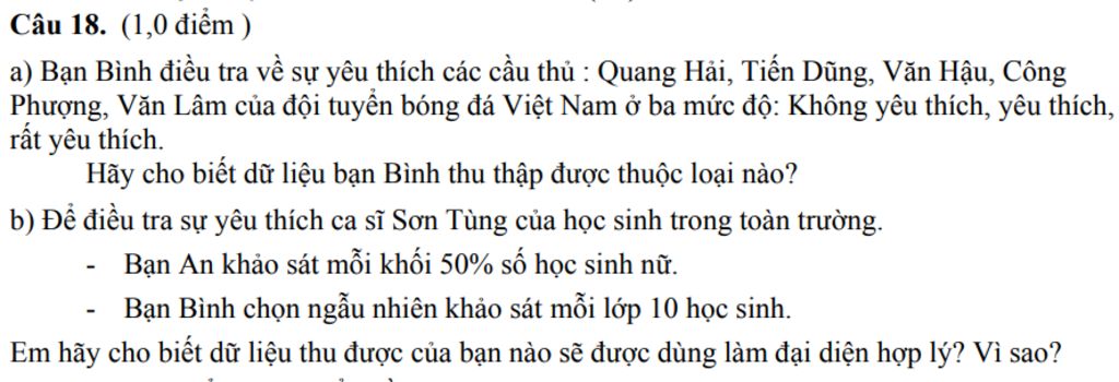 `b)` Vì bạn Bình ngẫu nhiên khảo sát `10` bạn học sinh của mỗi lớp nên trong thông tin khảo sát của bạn Bình sẽ có cả bạn nam và bạn nữ do đó dữ liệu thu thập được của bạn Bình sẽ được dùng làm đại diện hợp lý hơn