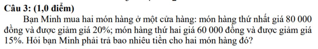 Vậy bạn Minh phải trả số tiền cho hai món hàng đó là: `115 000` đồng