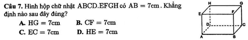 `-` Xét hình hộp chữ nhật `ABCD.EFGH` ta có: `AB=DC=HG=7cm`
