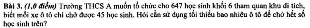 Ta có: `647:45=14` (xe), dư `17` học sinh