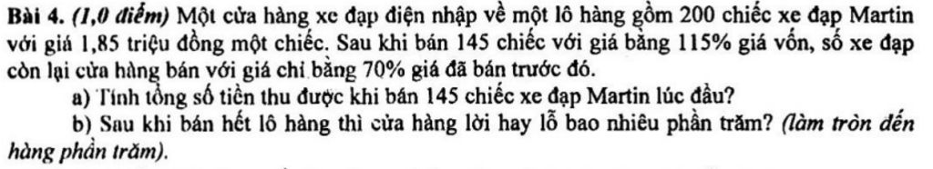 Bài 4. (1,0 điểm) Một cửa hàng xe đạp điện nhập về một lô hàng gồm 200 chiếc xe đạp Martin với giá 1,85 triệu đồng một chiếc. Sau khi bán 145 chiếc với giá bằng 115% giá vốn, số xe đạp còn lại cửa hàng bán với giá chỉ bằng 70% giá đã bán trước đó.