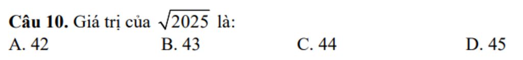Giá trị $\sqrt{2025}$ `=` $\sqrt{(45^2)}$ `= 45`