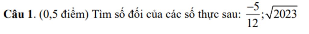 $\text{→ Số đối của $\dfrac{-5}{12}$ là $\dfrac{5}{12}$ }$$\\$ $\text{→ Số đối của $\sqrt{2023}$ là $\sqrt{-2023}$}$$\\$ $#hoangnam$