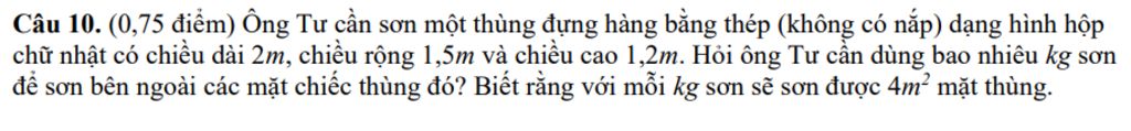 Vậy ông Tư cần dùng `2,85` kg sơn để sơn bên ngoài mặt chiếc thùng.
