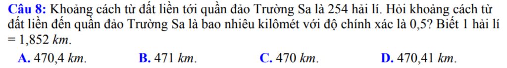 Câu 8: Khoảng cách từ đất liền tới quần đảo Trường Sa là 254 hải lí. Hỏi khoảng cách từ đất liền đến quần đảo Trường Sa là bao nhiêu kilômét với độ chính xác là 0,5? Biết 1 hải lí = 1,852 km.