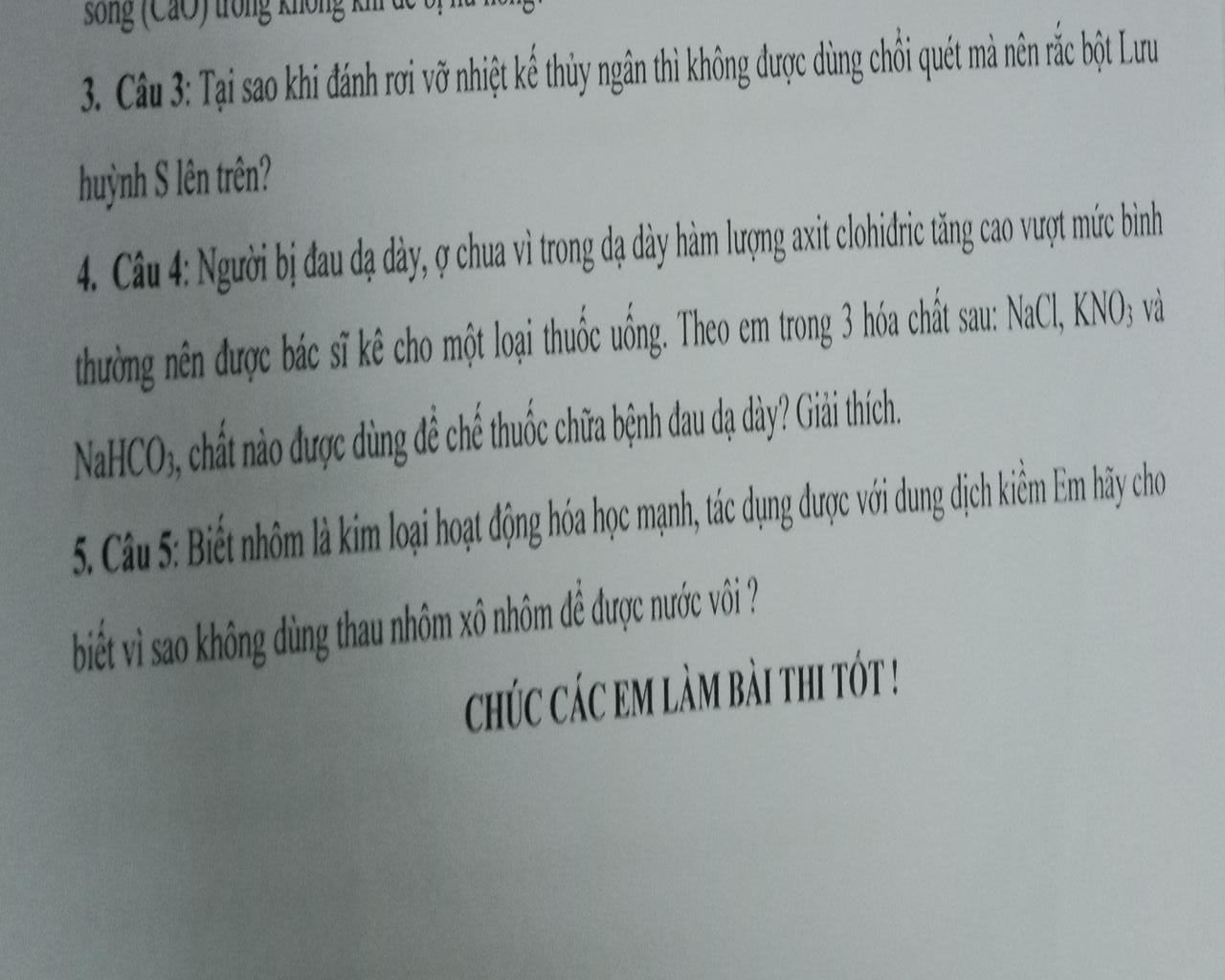 câu 5 nhôm là kim loại lưỡng tính nên khi đựng nước vôi thì nhôm sẽ pư với nước vôi nên không thể dùng nhôm đựng