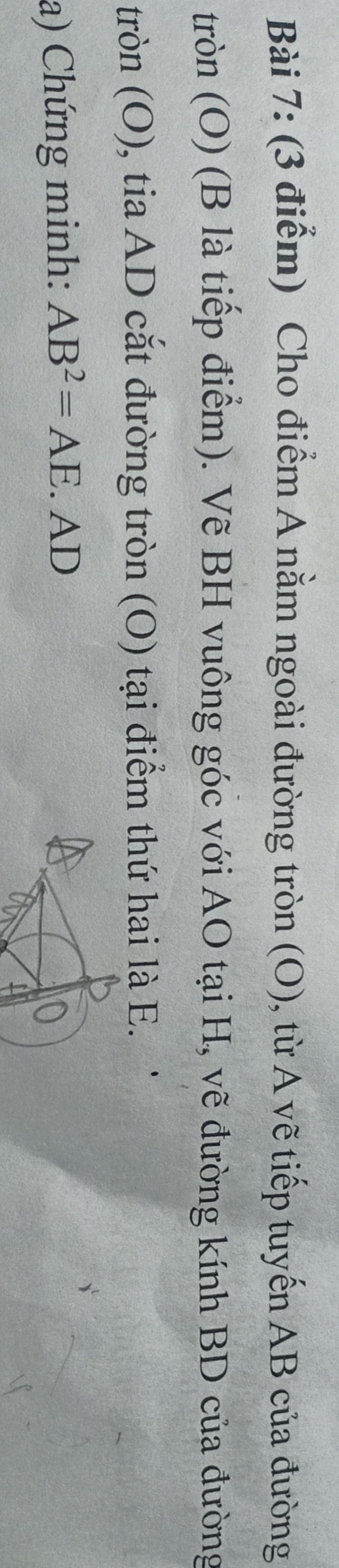 Bài 7: (3 điểm) Cho điểm A nằm ngoài đường tròn (O), từ A vẽ tiếp tuyến AB của