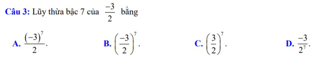 Lũy thừa bậc `7` của `-3/2` được viết là: `(-3/2)^7`