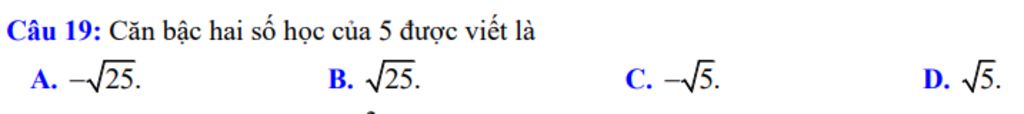 `-` căn bậc hai số học của `5` là `sqrt{5}`