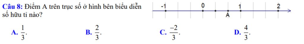 `@` `A` nằm bên phải số `0` nên `A` là số dương.Mỗi đơn vị cách nhau `3` phần mà điểm `A` nằm trước số `1=3/3` một phần nên `A=2/3`