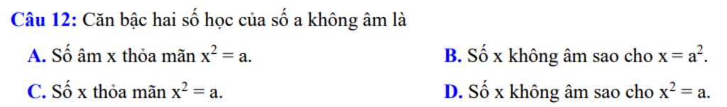 Câu 12: Căn bậc hai số học của số a không âm là