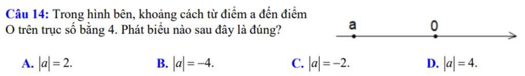 `@` Khái niệm: Khoảng cách từ điểm `a` trên trục số đến gốc `O` là giá trị tuyệt đối của số `a`, kí hiệu là `|a|`