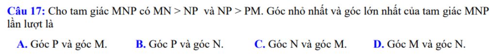 Góc nhỏ nhất là `hatN ;` lớn nhất là `hatP`