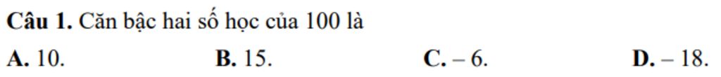 `->` `sqrt(100)=10` vì `10^2=100` và `10>0`