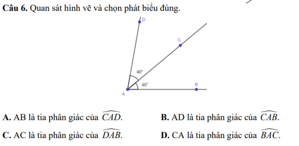 Ta thấy tia `AC` nằm giữa hai cạnh `AD` và `AB` và tạo với hai cạnh ấy hai góc bằng nhau `(=40^@)`