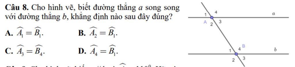 Câu 8. Cho hình vẽ, biết đường thẳng a song song với đường thẳng b, khẳng định nào sau đây đúng?