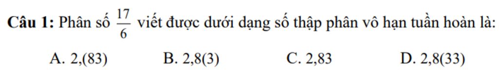Câu `1:` Phân số `17/6` viết được dưới dạng số thập phân vô hạn tuần hoàn là`:`