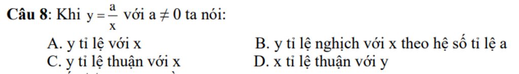 `y` tỉ lệ nghịch với `x` theo hệ số tỉ lệ `a`