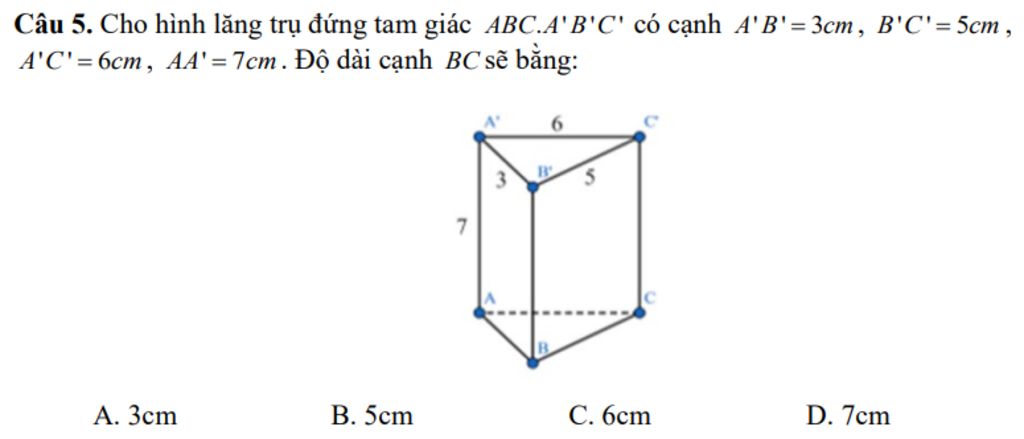 Câu 5. Cho hình lăng trụ đứng tam giác ABC.A'B'C' có cạnh A'B' = 3cm, B'C' = 5cm, A'C' = 6cm, AA' = 7cm. Độ dài cạnh BC sẽ bằng: