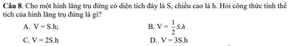 Câu 8. Cho một hình lăng trụ đứng có diện tích đáy là S, chiều cao là h. Hỏi công thức tính thể