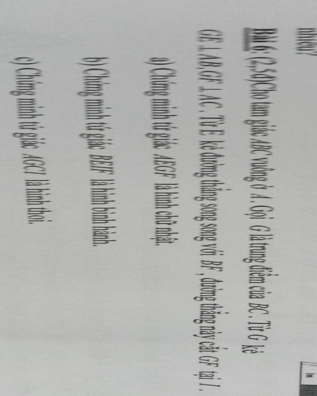 Bài 6: (2,5đ) Cho tam giác ABC vuông ở A. Gọi G là trung điểm của BC. Từ G kẹ