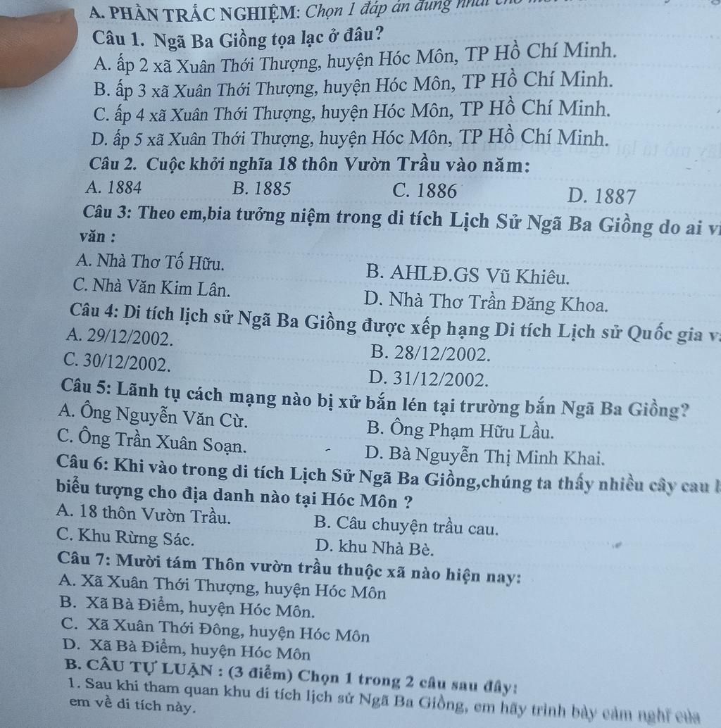 Câu 6: Khi vào trong di tích Lịch Sử Ngã Ba Giồng,chúng ta thấy nhiều cây cau là biểu tượng cho địa danh nào tại Hóc Môn ?