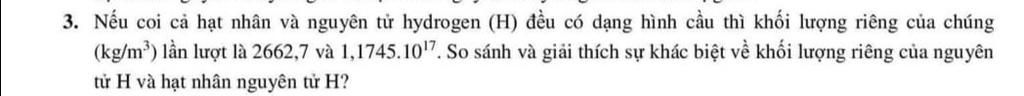 3. Nếu coi cả hạt nhân và nguyên tử hydrogen (H) đều có dạng hình cầu thì khối lượng riêng của chúng
