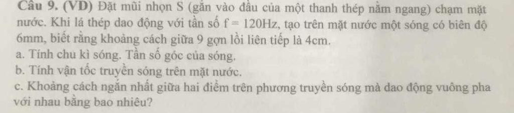 c. Do 2 điểm dao động vuông pha nên độ lệch pha `\Delta\varphi = pi/2 (rad)`