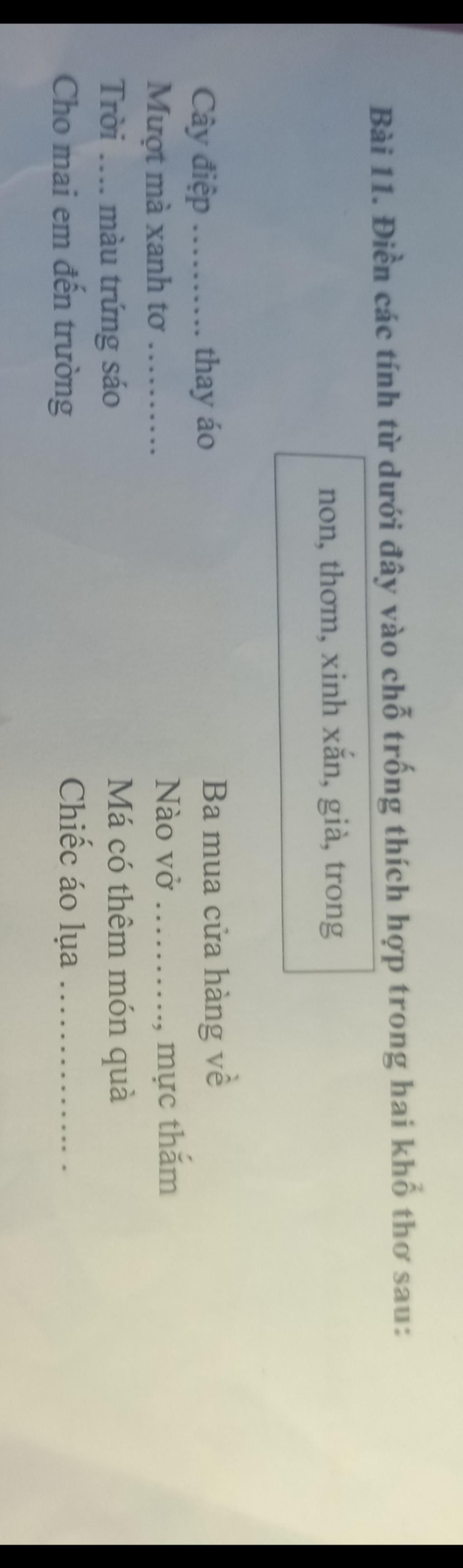 `-` Các từ cần điền là: ( theo thứ tự) già `->` non `->` trong `->` thơm `->` xinh xắn