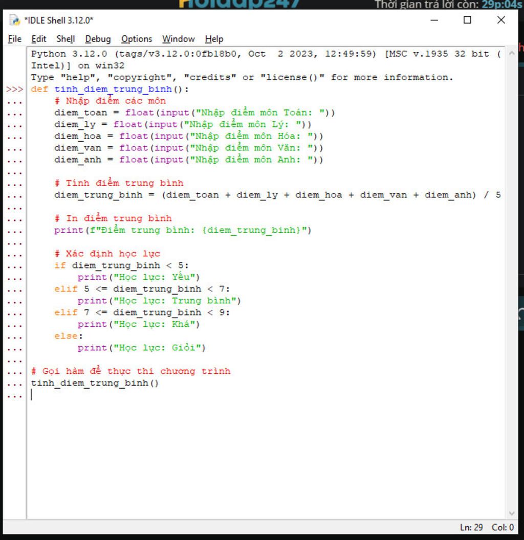 hãy sử dụng hàm py thon để tính điểm trung bình của học sinh và in ra màn hình console.bắt buộc phải dùng hàm để làm bài này