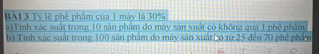 b) Gọi $A$ là biến cố trong $100$ sản phẩm do máy sản xuất có từ $25$ đến $70$ phế phẩm thì $A\sim B(n,p)$, $n=100,p=0,3$.