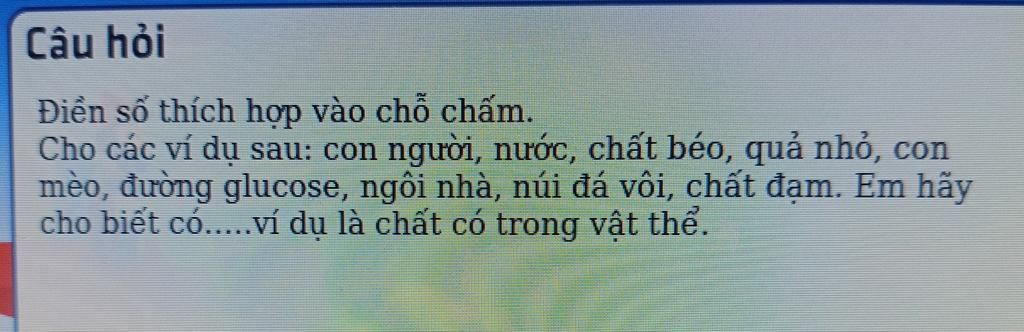 Cho các ví dụ sau: con người, nước, chất béo, quả nhỏ, con