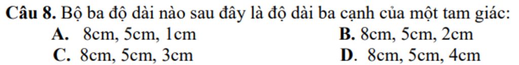 `5cm + 4cm = 9cm gt 8cm` chọn
