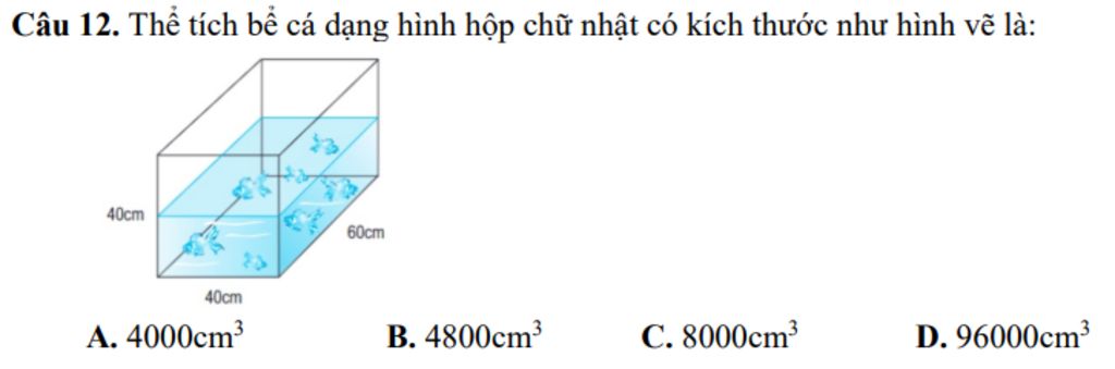 `->` Thể tích bể cá dạng hình hộp chữ nhật có kích thước như hình vẽ là: