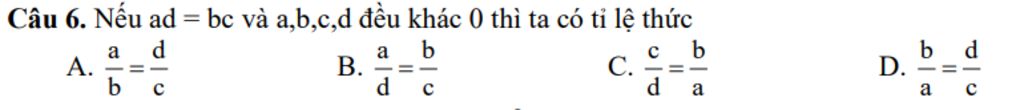 Câu 6. Nếu ad = bc và a,b,c,d đều khác 0 thì ta có tỉ lệ thức: