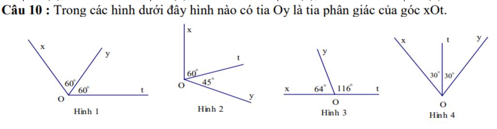 Câu 10 : Trong các hình dưới đây hình nào có tia Oy là tia phân giác của góc xOt.
