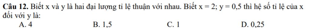 Thay `x=2` và `y=0,5` vào ta được `a=(0,5)/2=0,5:2=0,25`