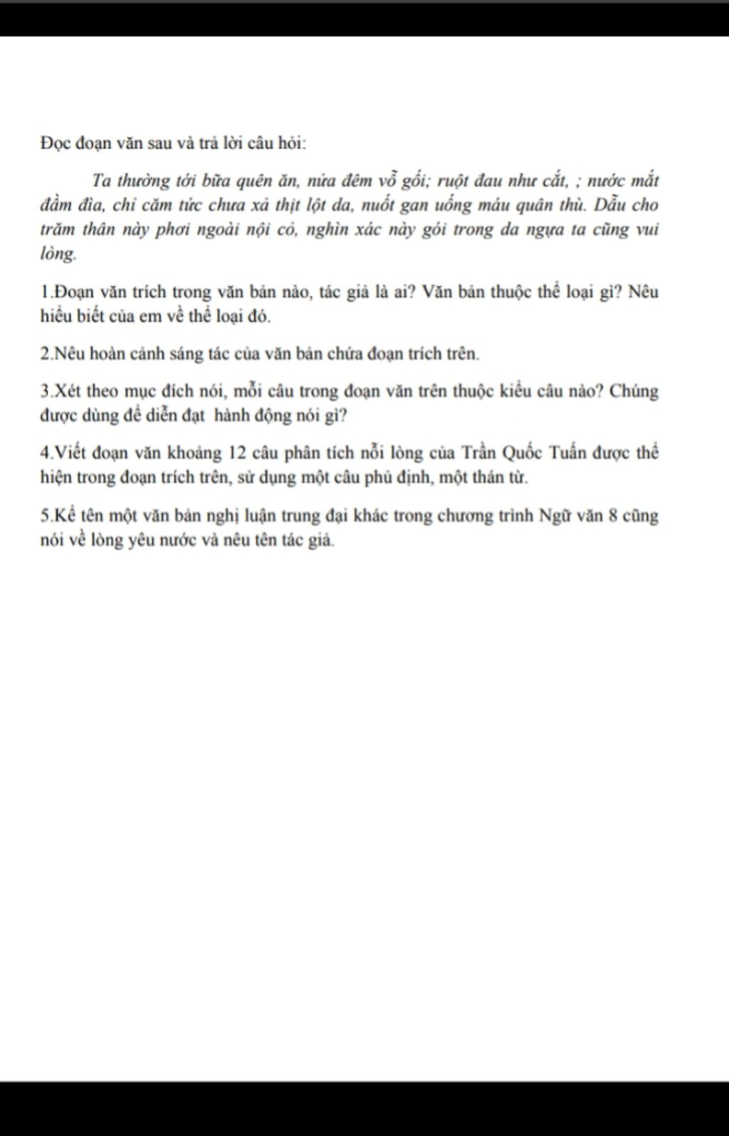 5.Kể tên một văn bản nghị luận trung đại khác trong chương trình Ngữ văn 8 cũng nói về lòng yêu nước và nêu tên tác giả.