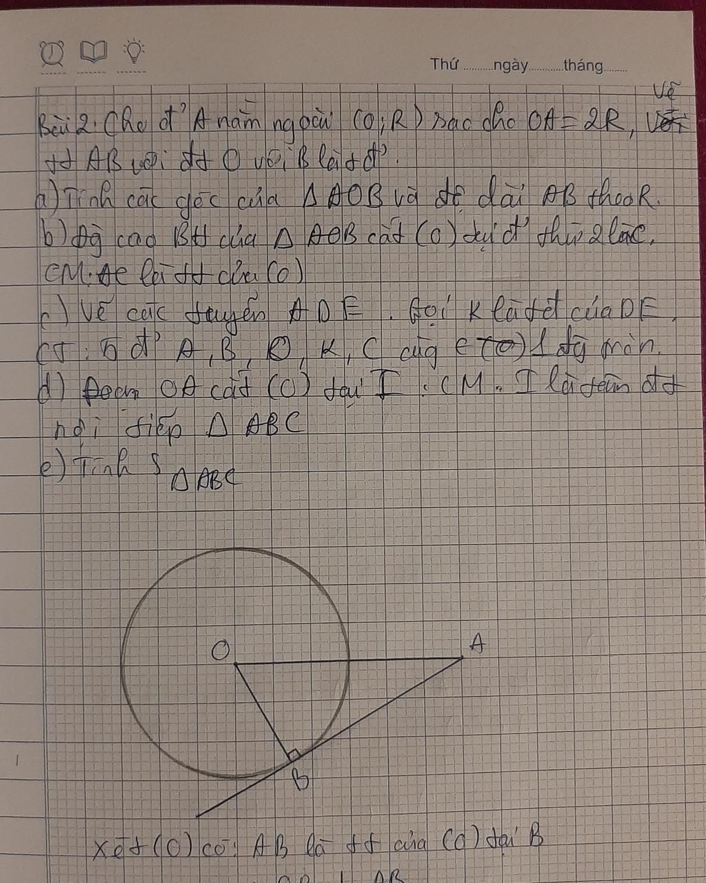 Xét `\DeltaAOB` vuông tại `B` có: `{(AB=sqrt{OA^2-OB^2}=sqrt{4R^2-R^2}=Rsqrt3),(sinBAO=(OB)/(OA)=R/(2R)=1/2),(hat{BOA}=90^o -\hat{BAO}):}`