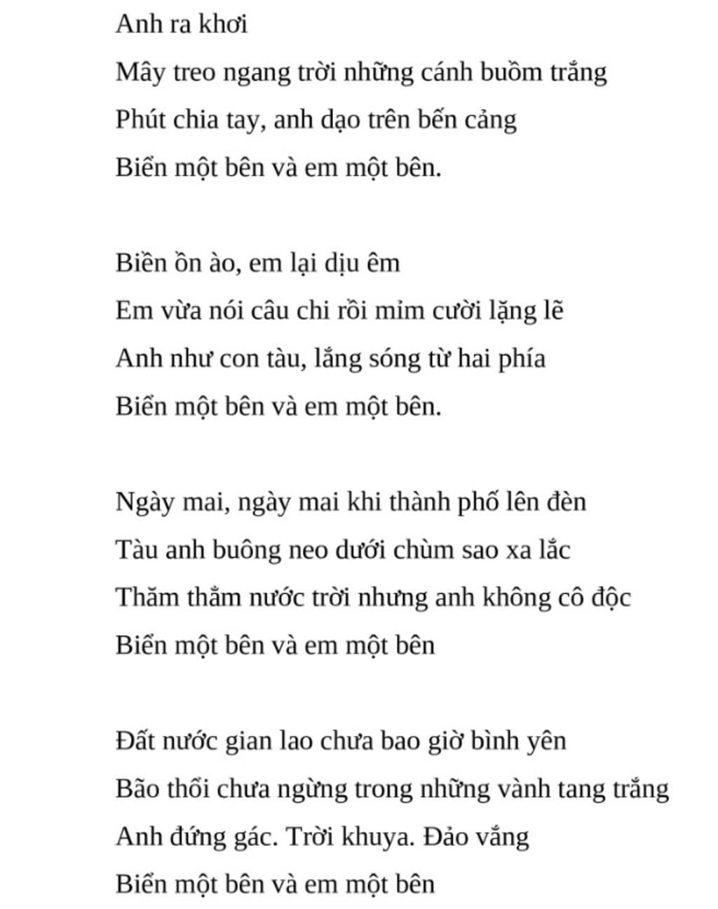 `-` Bài thơ nói về `1` người thanh niên xung phong trong công cuộc xây dựng đất nước. Biển là hình ảnh, là công việc mà một hải quân luôn gắn liền trong chuyến đường. Qua đó nói lên tinh thần lạc quan, yêu nghề, yêu nước. Hình ảnh "em" cũng đc lặp lại nhiều lần ý nói nỗi nhớ da diết của người thanh niên. Dù xa xôi nhưng vẫn mong nhớ. Cả `2` hình ảnh xuyên suốt đc nhắc song hành cạnh nhau ý nói lên vai trò của cả `2`. Cái gì cũng quan trọng trong người thanh niên. Nghĩa vụ yêu nước và người em nơi quê nhà đều quan trọng và đáng quý.