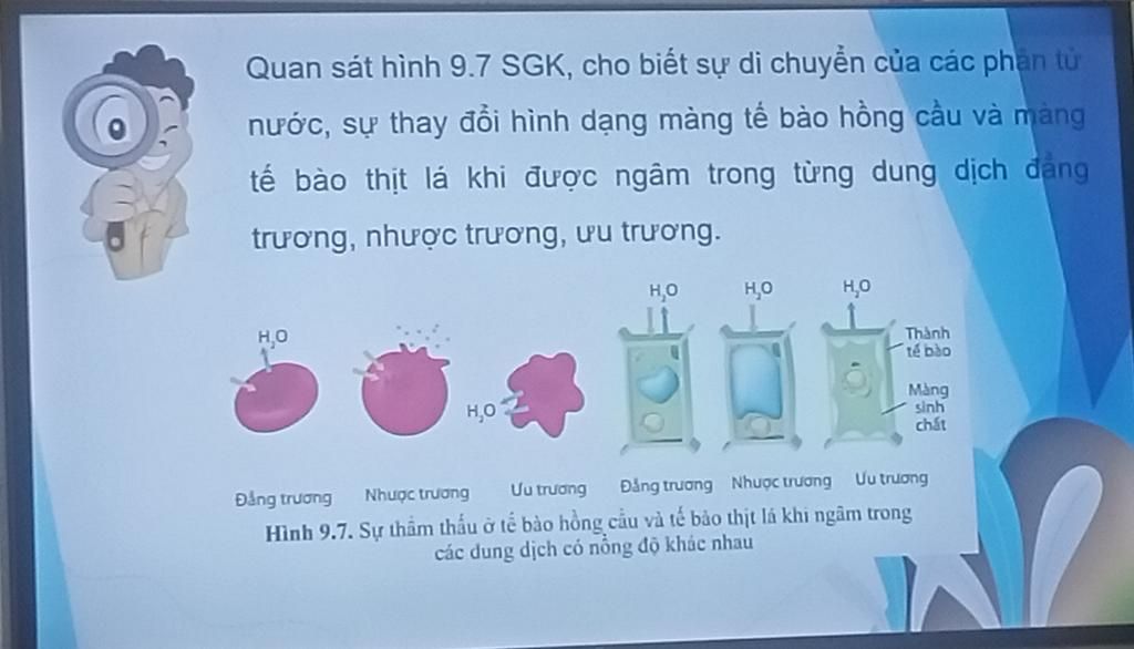 - Khi cho tế bào thịt lá vào môi trường nhược trương tức là nồng độ chất tan môi trường ngoài nhỏ hơn môi trường trong tế bào nên nước di chuyển từ ngoài tế bào vào trong tế bào-> tế bào thịt lá to lên.