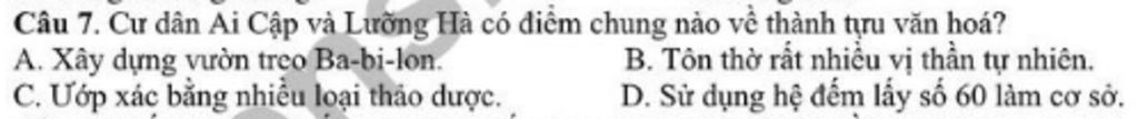 Câu 7. Cư dân Ai Cập và Lưỡng Hà có điểm chung nào về thành tựu văn hoá?