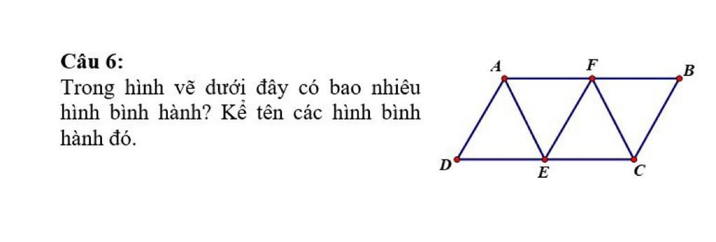 Trong hình có tổng là 4 hình bình hành, 1 hình bình hành lớn, 3 hình bình hành nhỏ. Tên các hình bình hành là: